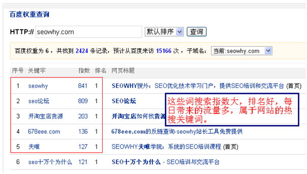 我們可以從站長(zhǎng)工具(http://mytool.chinaz.com/baidusort.aspx)上查詢,網(wǎng)站有多少流量來(lái)自搜索引擎,最高的那些就是熱搜關(guān)鍵詞。